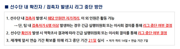 단 팀 내 접촉자가 6명 이상 발생한 경우 리그 중단 여부를 결정하도록 했다. 선수단 확진자가 나올 경우에는 역학조사 결과에 따라 리그 중단여부를 결정하도록 매뉴얼이 작성됐다.