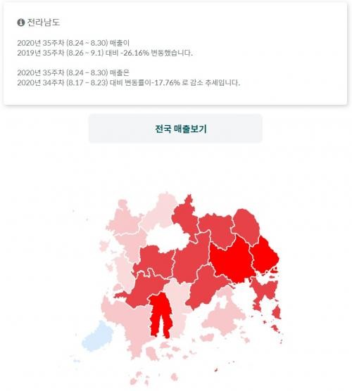 전남(-26.16%)과 광주(-25.52%)는 서울에 이어 전국 매출 감소율 2~3번째를 차지했다. 지역 매출은 전주(17~23일)에 비해서도 광주는 12.42%, 전남 17.76% 떨어졌다.