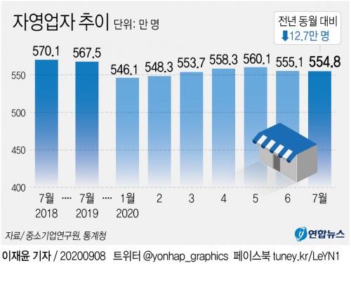 8일 통계청 경제활동인구조사에 따르면 지난 7월 기준 전국 자영업자는 554만8000명으로, 1년 전보다 12만8000명(-2.3%) 감소했다.