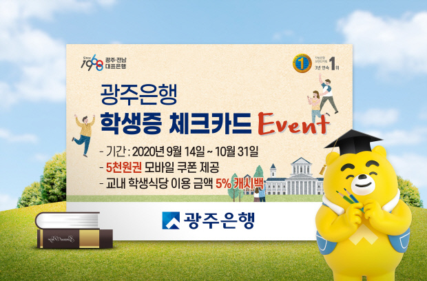 광주은행은 14일부터 오는 10월31일까지 ‘학생증 체크카드 이벤트’를 진행한다고 13일 밝혔다.