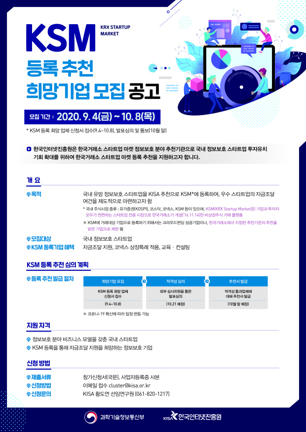 한국인터넷진흥원(KISA)이 오는 10월 8일까지 ‘한국거래소 스타트업 마켓’(KSM·KRX Startup Market) 등록을 희망하는 스타트업을 모집한다.