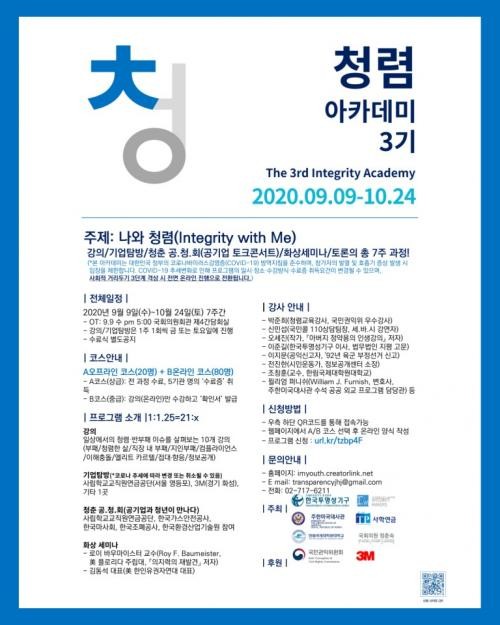 지난 2018년부터 시작해 올해 세 번째를 맞은 ‘청렴 아카데미’ 주제는 ‘나와 청렴’이다. 교육 기간 동안 이론 강의, 기업 탐방, 토크 콘서트, 토론, 화상 세미나 등이 펼쳐진다.