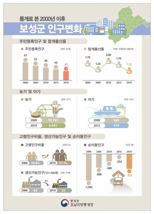 호남지방통계청 보성사무소 관계자는 “인구 감소나 노인 인구 증가 등은 농어촌 지역이 안고 있는 문제를 여실히 보여주는 것”이라며 “시도 단위 통계가 아닌 특정 지자체만의 통계라는 점에서 향후 대책 수립 등에 도움이 되길 바란다”고 말했다.