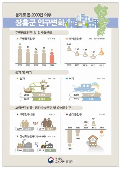 고흥은 2000년 10만1000명에서 2019년 말 6만5000명으로 35.7%(3만6000명) 감소했다. 보성은 6만1000명에서 4만1000명으로 32.5%, 장흥은 5만3000명에서 3만9000명으로 27.8% 격감했다.