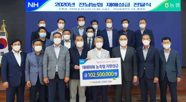 전남지역 농·축협 임직원들이 지난 25일 무안군 삼향읍 농협 전남지역본부 대강당에서 열린 ‘2020년 전남농협 재해성금 전달식’에서 성금 1억250만원을 호우 피해 농협에 전달하고 있다. <농협 전남본부 제공>