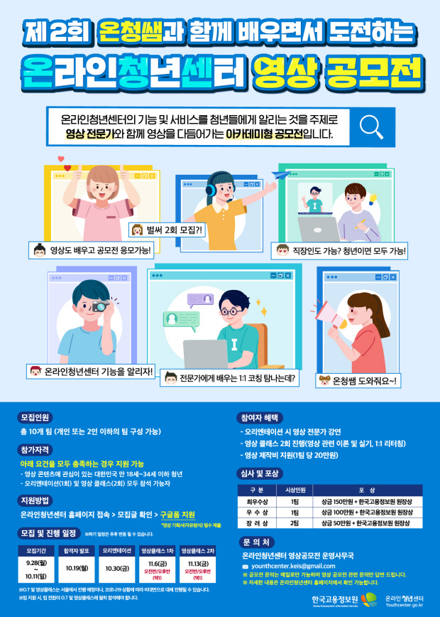 한국고용정보원이 온라인청년센터 기능 및 서비스 홍보를 주제로 영상공모전을 갖는다. 영상제작을 배우고, 청년들을 위한 정책·공간을 알려 상도 받을 수 있는 기회다.