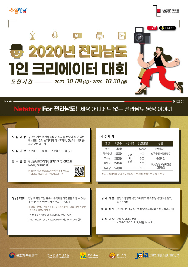 전남도와 전남정보문화산업진흥원이 지역의 우수 1인 크리에이터 발굴과 영상 콘텐츠 활성화를 위해 ‘2020년 전라남도 1인 크리에이터 대회’를 연다.