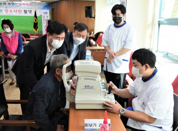 농협 광주지역본부와 북광주농협은 지난 15일 집중호우로 피해를 입은 지역조합을 대상으로 한 ‘농업인 행복버스’ 사업을 시작했다. 이날 고령 농업인 등 150명은 무료 의료검진과 장수사진 촬영 등을 지원 받았다.<농협 광주본부 제공>