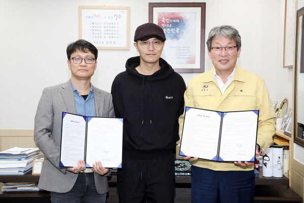 정읍시는 영화제작사 파인스토리와 지난 16일 정읍시청에서 영화 ‘내겐 너무 소중한 너’ 촬영 및 마케팅 업무협약을 체결했다. 왼쪽부터 파인스토리 관계자와 영화배우 진구, 유진섭 시장. <정읍시 제공>