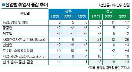 전남에서는 사회간접자본 및 기타서비스업과 전기·운수·통신·금융 취업자 타격이 컸다.