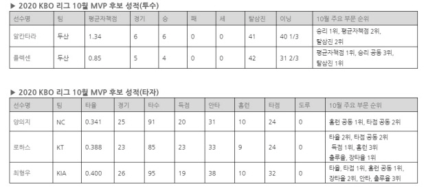 10월 MVP는 8일 발표된다.
