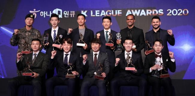 5일 서울 스위스그랜드 호텔에서 열린 '하나원큐 K리그 대상 시상식 2020'에서 수상자들이 기념 촬영을 하고 있다. 윗줄 왼쪽부터 시계방향으로 권경원(상주), 조현우(울산), 홍정호(전북), 한교원(전북), 주니오(울산), 세징야(대구), 아랫줄 강상우(포항), 송민규(포항), 김기동 감독(포항), 손준호(전북), 김태환(울산). /연합뉴스