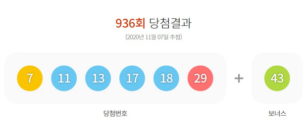 제936회 로또복권 행운의 번호는 ‘7, 11, 13, 17, 18, 29’번이 됐다.