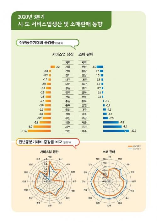 반면 전남(3.4%), 충남(1.7%), 경남(1.3%), 대전(0.9%), 울산(0.9%), 경기(0.7%), 경북(0.6%), 전북(0.5%) 등 8개 지역은 사회적 거리두기 강화로 인한 ‘집 앞 소비’ 증가 영향 등으로 소매판매가 소폭 증가했다.