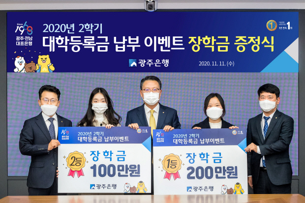 광주은행(은행장 송종욱·가운데)은 최근 동구 대인동 본점에서 ‘2020년 2학기 등록금 납부 이벤트’ 당첨고객 402명 가운데 1등(1명)에게는 장학금 200만원, 2등(2명)에 장학금 100만원을 전달했다.<광주은행 제공>
