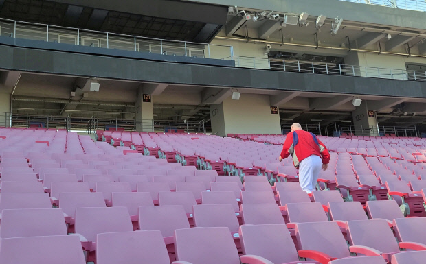 미국 귀국 대신 한국 잔류를 선택한 위더마이어 수석코치는 관중석을 뛰면서 체력관리에 나섰습니다.