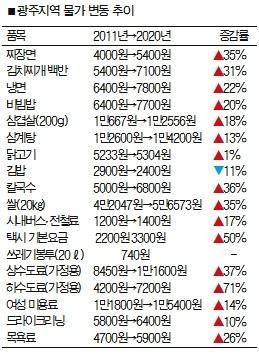 지난 10년 동안 광주지역 짜장면 한 그릇 가격이 4000원에서 5400원으로 35%(1400원) 오른 것으로 나타났다. 30대 주요 물가 가운데 가장 높은 상승률을 보인 품목은 공공요금인 하수도료(가정용)으로, 20㎥당 4200원에서 7200원으로 71%(3000원) 올랐다.