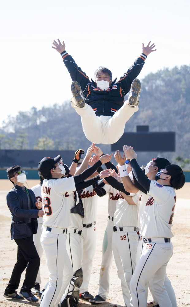| 제10회 아로마라이프배 무등기 사회인 야구 광일리그에서 우승한 삼진이 이승신 감독을 헹가래치고 있다. /최현배 기자 choi@kwangju.co.kr |