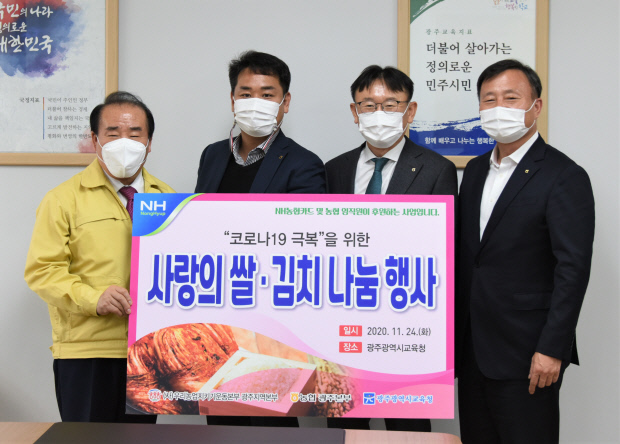 NH농협은행 광주본부(본부장 최영·오른쪽 두번째)와 농협 광주지역본부(본부장 강형구·맨 오른쪽)는 24일 돌봄이 필요한 청소년을 위해 1300만원 상당 사랑의 쌀·김장김치를 광주시교육청에 전달했다. 이번 기부는 (사)우리농업지키기운동본부 광주지역본부가 후원했다.<농협 광주본부 제공>