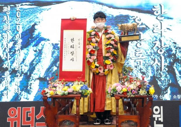 23일 강원 평창군 송어종합공연체험장에서 열린 위더스제약 2020 민속씨름리그 4차 평창평화장사씨름대회에서 한라장사(105㎏ 이하)에 등극한 오창록이 꽃가마를 타고 기념 촬영을 하고 있다. <대한씨름협회 제공>