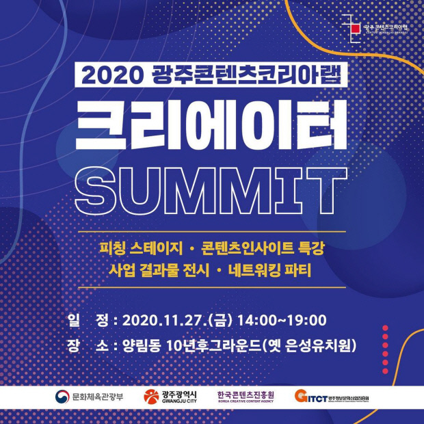 광주정보문화산업진흥원은 오는 27일 오후 2시 남구 양림동 복합문화공간 ‘10년 후 그라운드’에서 ‘광주콘텐츠코리아랩 크리에이터 서밋’을 연다고 25일 밝혔다.