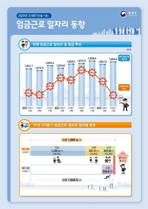 26일 통계청이 발표한 ‘2분기 임금근로 일자리 동향’에 따르면 올해 2분기(5월 기준) 임금근로 일자리는 1889만6000개로, 1년 전보다 21만1000개(1.1%) 증가했다.