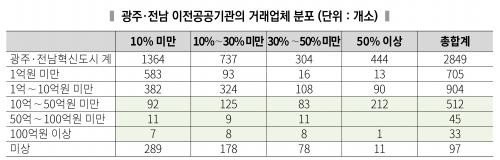 거래 공공기관에 대한 매출을 알 수 없는 업체를 제외하면 해당 공공기관 거래액이 10억원 미만인 업체 비중은 광주 81.5%·전남 63.9%로 나타났다.