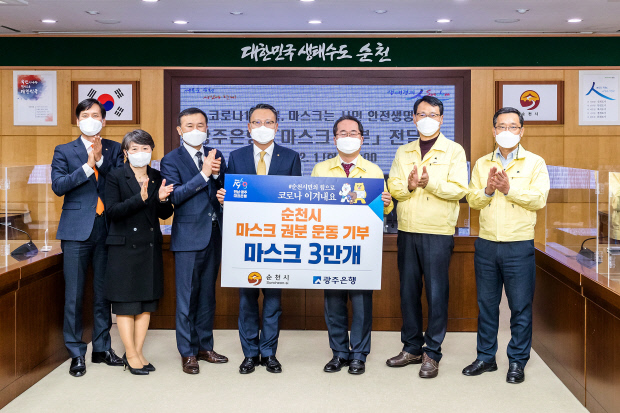 송종욱(가운데) 광주은행장은 지난 1일 마스크 나누기인 ‘권분(權分) 운동’을 펼치고 있는 순천시에 마스크 3만개를 전달했다. 기부한 마스크는 순천 주요 관광지와 공공장소, 대중 교통시설 등에 비치된다. <광주은행 제공>