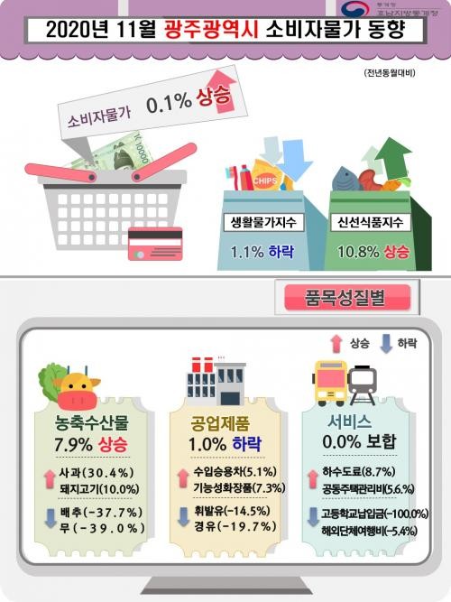 2일 호남지방통계청이 발표한 11월 소비자 물가 동향에 따르면 광주의 소비자 물가지수는 104.71로 전월 대비 0.2% 내렸으며 전년 같은 달과 비교해 0.1% 올랐다.
