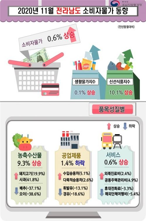 전남 물가지수는 105.69로 전월 대비 0.5% 내리고, 전년 같은 달 대비 0.6% 올랐다.