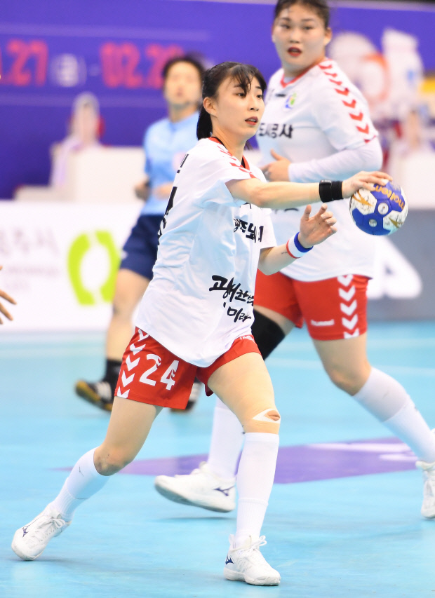 광주도시공사 강경민이 지난 7일 충북 올림픽국민생활관에서 열린 2020-2021 SK핸드볼 코리아리그 여자부 1라운드 부산시설공단과 경기에서 패스하고 있다. <대한핸드볼협회 제공>