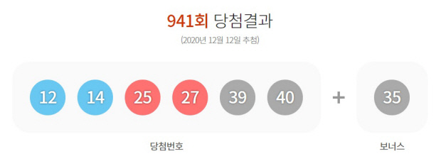 12일 제941회 로또복권 추첨에서 ‘12, 14, 25, 27, 39, 40’이 1등 번호가 됐다.