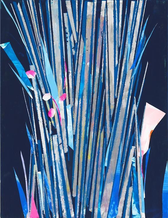 이번 전시에서 눈에 띄는 건 콜라주 작업이다. 겉에 코팅이 된 종이 팔레트에 다양한 색깔을 입히고 일일이 잘라 화면에 붙여가며 만들어낸 조형미는 색과 선, 면이 어우러지면서 역동적인 이미지를 연출한다. 수국 등 꽃과 열매 등이 구체적 모습으로 형상화되기 보다는 하나의 이미지로 변용되면서 다양한 이야기를 들려준다.
