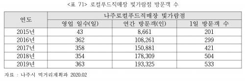나주시 자료에 따르면 로컬푸드 직매장 빛가람점은 혁신도시 조성 초기였던 지난 2015년 1일 평균 방문객 수는 201명이었지만 지난해는 533명으로 2.7배(165.2%) 뛰었다.