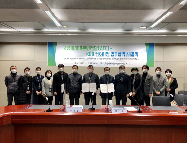 국립아시아문화전당(ACC·전당장 직무대리 박태영)과 KOR연합체(연구단장 표인주)가 아시아문학 분야 협업체계 구축과 교류 활성화를 위해 17일 ACC에서 업무협약을 체결했다.