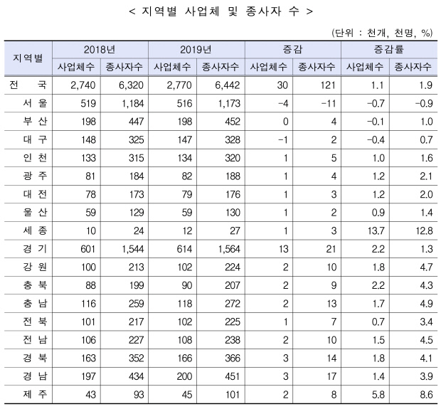 종사자 수는 광주는 4000명(2.1%) 증가한 18만8000명, 전남은 1만명(4.5%) 늘어난 23만8000명으로 조사됐다. 두 지역 종사자 수 증가율은 전국 평균(1.9%)을 웃돌았다.