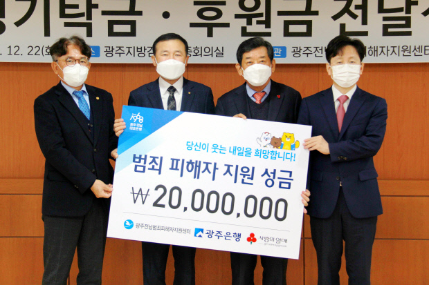 광주은행(은행장 송종욱)은 30일 광주지방검찰청에서 광주전남범죄피해자지원센터에 성금 2000만원을 전달했다. 왼쪽부터 이은열 광주전남범죄피해자지원센터 이사장, 고병일 광주은행 부행장, 한상원 광주사회복지공동모금회장, 여환섭 광주지방검찰청 검사장.<광주은행 제공>