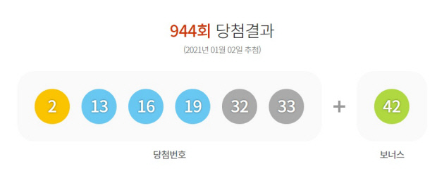 2일 진행된 제944회 로또복권 추첨에서 ‘2, 13, 16, 19, 32, 33’이 1등 번호가 됐다. 2등 보너스 번호는 42번이다.