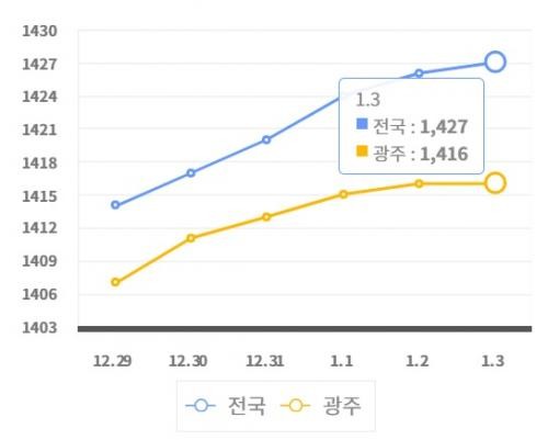 지역 휘발유 값이 1400원을 넘긴 건 광주는 지난 달 27일, 전남은 같은 달 28일부터다. 일 평균 기준 전국 주유소 휘발유 판매가격은 지난해 3월 이후 9개월 만인 12월25일 1400원대에 진입했다.