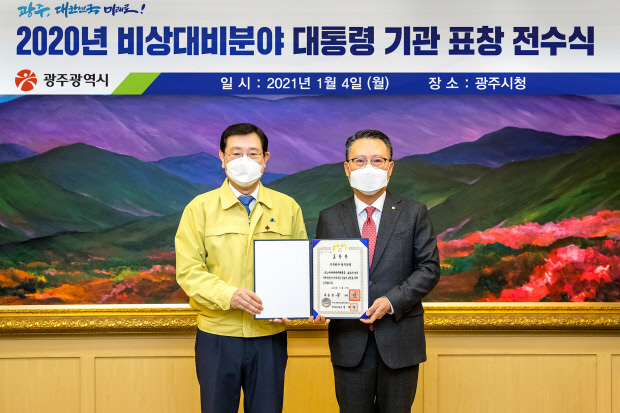 광주은행 송종욱(오른쪽) 은행장은 4일 ‘2020년 비상대비분야 대통령 기관 표창 전수식’에 참석해 이용섭 광주시장으로부터 최우수기관 대통령 표창을 받았다.<광주은행 제공>