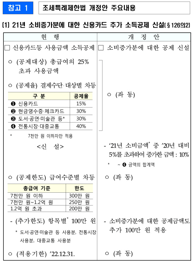 여기에 추가 사용분에 대한 공제율 10%를 적용하면 공제율이 기존 15~40%에서 25~50%로 올라갈 수 있다. 추가로 주는 공제한도는 100만원으로 제한한다.