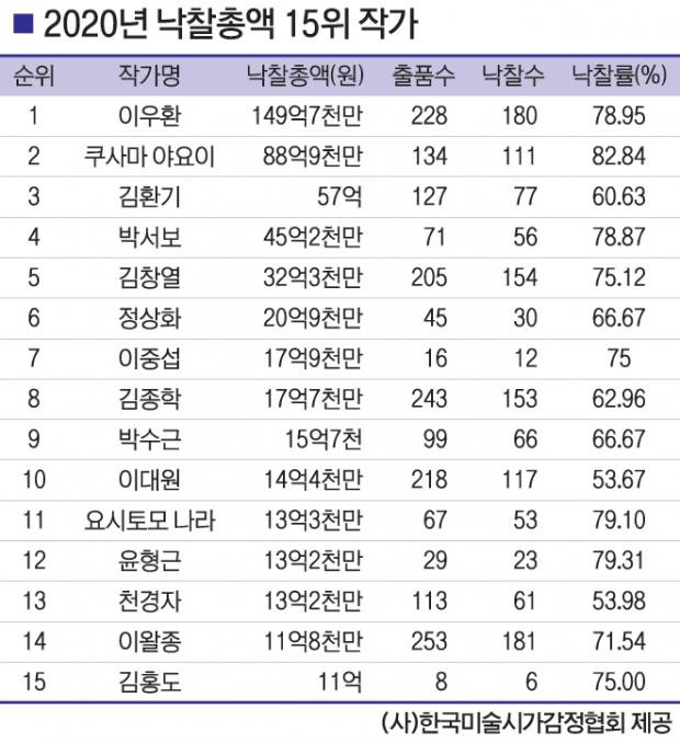 지난 한해 국내 미술품 경매에서 가장 많은 낙찰 총액을 기록한 작가는 이우환 화백이었다. 단일 작품 최고 낙찰가는 일본 작가 쿠사마 야요이가 기록했다. 또 경매 시장 낙찰 총액은 1153억원으로 지난 5년간 최저 수준을 기록, 코로나 19 등으로 미술 시장이 크게 위축된 것으로 나타났다.