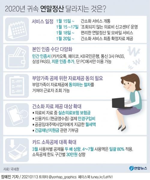 국세청은 연말정산 소득·세액공제에 필요한 증명자료를 조회할 수 있는 홈택스(hometax.go.kr) 연말정산 간소화 서비스를 15일 개통한다고 밝혔다.