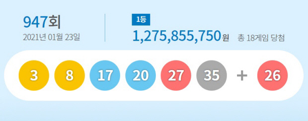 ‘3, 8, 17, 20, 27, 35’가 제947회 로또복권 추첨에서 1등 번호가 됐다. 18명이 1등에 당첨돼 12억 7585만 5750원을 받는다.