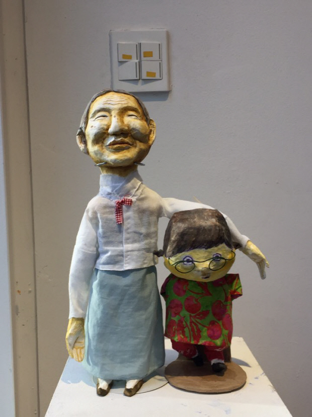 전시장에서 눈에 띄는 건 신문지와 사료 포대로 만든 3m 높이의 거대한 인형이다. 포항 도시재생사업에 참여했던 엄 작가가 ‘집’에 대한 이야기를 풀어내고 싶어 작업한 작품으로 자세히 들여다 보면 류시화의 시 한구절이 새겨져 있다. 입구에 설치된 대형 얼굴 인형은 엄 작가의 시어머니다. 남편과 일찍 사별해 홀로 두 아이를 키운 엄 작가는 음악을 하던 미국인 남편을 과천 마당극축제에서 만났고, 아이들이 모두 자리를 잡자 미국으로 떠났다.
