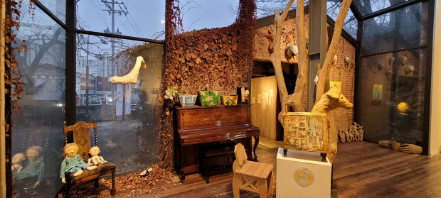 전시장에서 만나는 인형은 제각각 사연이 있고, 제작 방법도 다 다르다. 그림책에 등장하는 주인공같은 인형엄마 이야기를 듣다보면 동화의 나라에 온 듯한 기분이 든다. 사람들은 엄 작가의 설명을 들으며 개구리 인형을 쓰고 사진을 찍고, 손가락 인형으로 동화구연도 해본다. 딱 한 사람만 관람할 수 있는 ‘상자인형극’ 장치 등 전시장 곳곳에선 ‘숨은 그림 찾기’ 하듯 작품을 만날 수 있다. 붉은 벽돌, 담쟁이 덩굴 등이 어우러진 전시장에서 인형들과 시간을 보내다 보면 마음이 따뜻해진다. 아이들보다 어른이 더 즐거운 전시다.