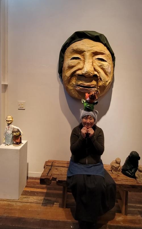 | ‘인형엄마’ 엄정애 작가가 인형을 머리에 쓰고 포즈를 취했다. 뒤는 미국인 시어머니 인형. |