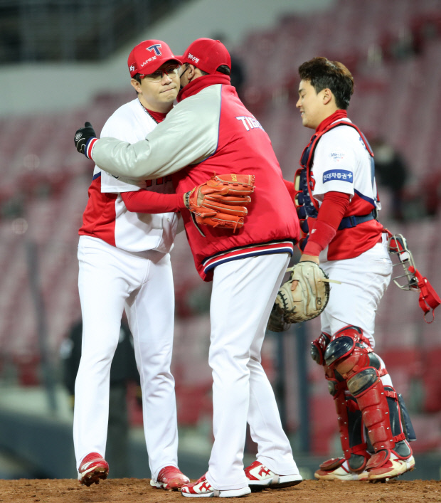 양현종이 메이저리그 진출을 이어가기로 하면서 30일 KIA와의 FA협상이 종료됐다. 사진은 2020 시즌 마지막 등판이었던 10월 29일 두산전에서 마운드에서 내려오기 전 서재응 투수코치와 포옹을 하는 모습. [KIA타이거즈 제공]