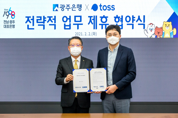 이날 송종욱 은행장과 이승건 ㈜비바리퍼블리카 대표는 광주시 동구 대인동 본점에서 ‘디지털 금융 신규 서비스 및 제휴 마케팅 활성화를 위한 업무협약’을 맺었다. 두 기관은 핀테크 기술에 기반한 금융서비스 제공에 힘을 모으기로 했다.