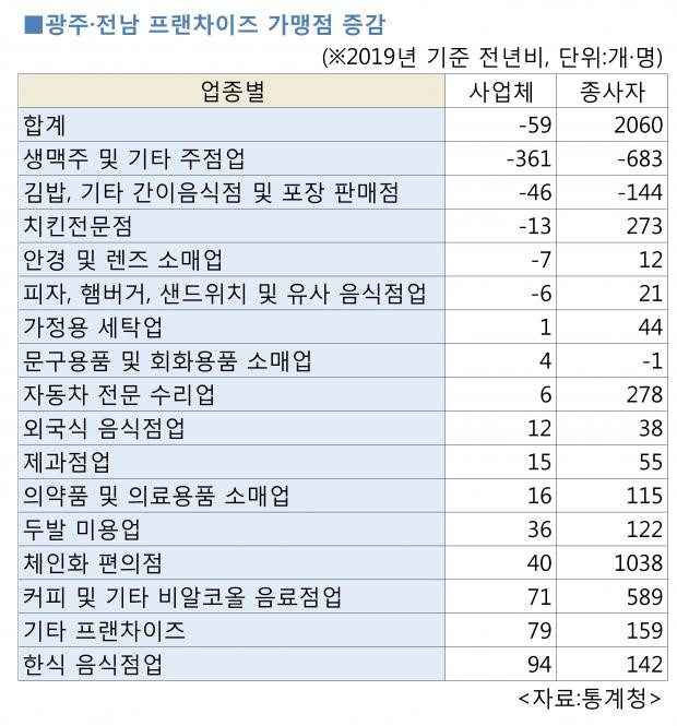 프랜차이즈 가맹점 가운데 한 해 동안 광주·전남에서 가장 많이 사라진 업종은 ‘생맥주 및 기타 주점업’으로, 점포 361개가 없어지고 종사자 683명이 줄어든 것으로 나타났다.